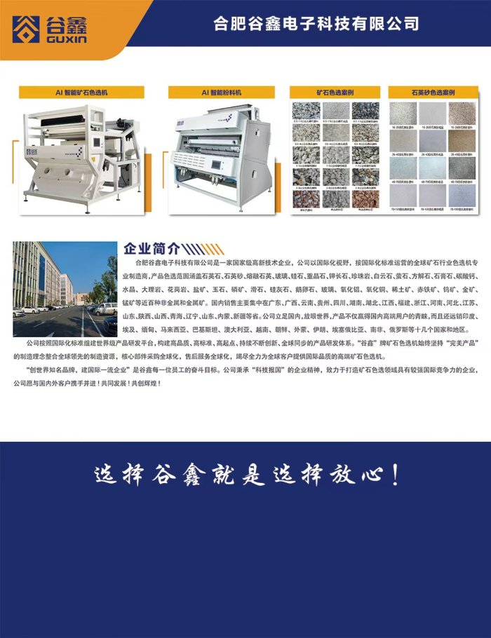 合肥谷鑫电子科技有限公司是一家以矿石色选机研发、生产、销售和服务于一体的国家高新技术企业,产品色选范围涵盖石英石、石英砂、熔融石英、钾长石、重晶石、珍珠岩、白云石、萤石、方解石、石膏石、碳酸钙、石灰石、大理石、花岗岩、盐矿、玉石、磷矿、滑石、硅灰石、鹅卵石、玻璃、氧化铝、氧化铜、钼矿、稀土矿、赤铁矿、钨矿、金矿、锰矿、高岭土等近百种金属和非金属行业。国内销售主要集中在广东、广西、云南、贵州、四川、湖南、湖北、江西、福建、浙江、河南、河北、江苏、山东、陕西、山西、青海、辽宁、山东、内蒙、新疆等省。公司立足国内,放眼世界,产品不仅畅销国内,而且还受到东南亚、埃及、乌兹别克斯坦、印度等几十个国家和地区矿山企业的认可和青睐。